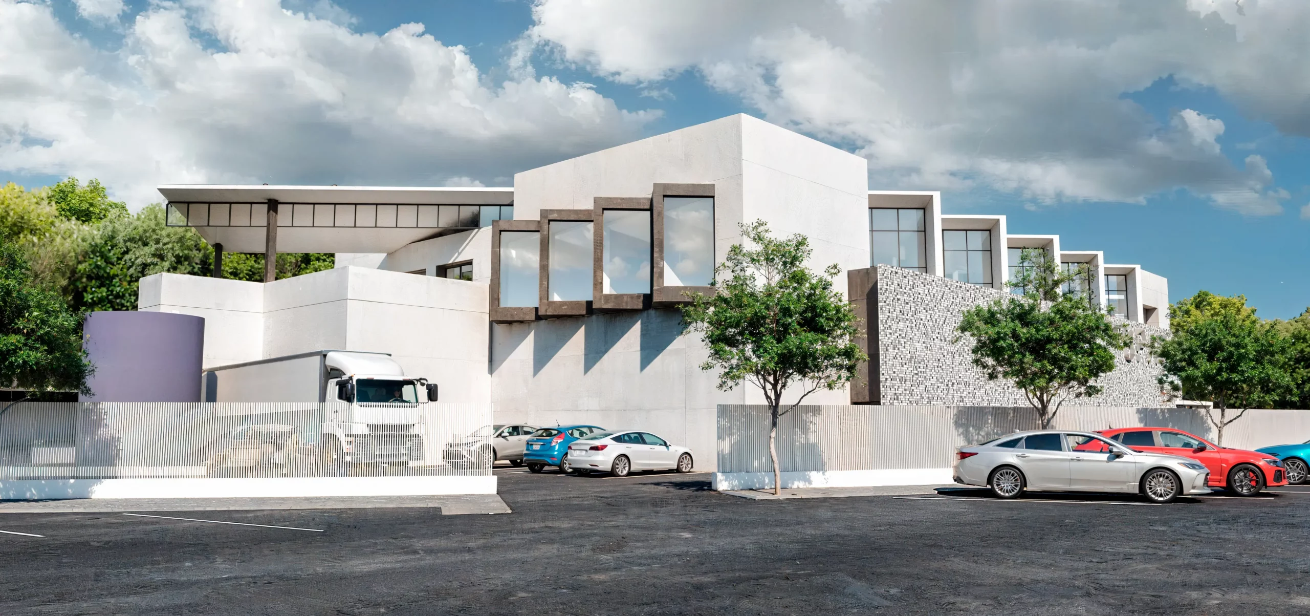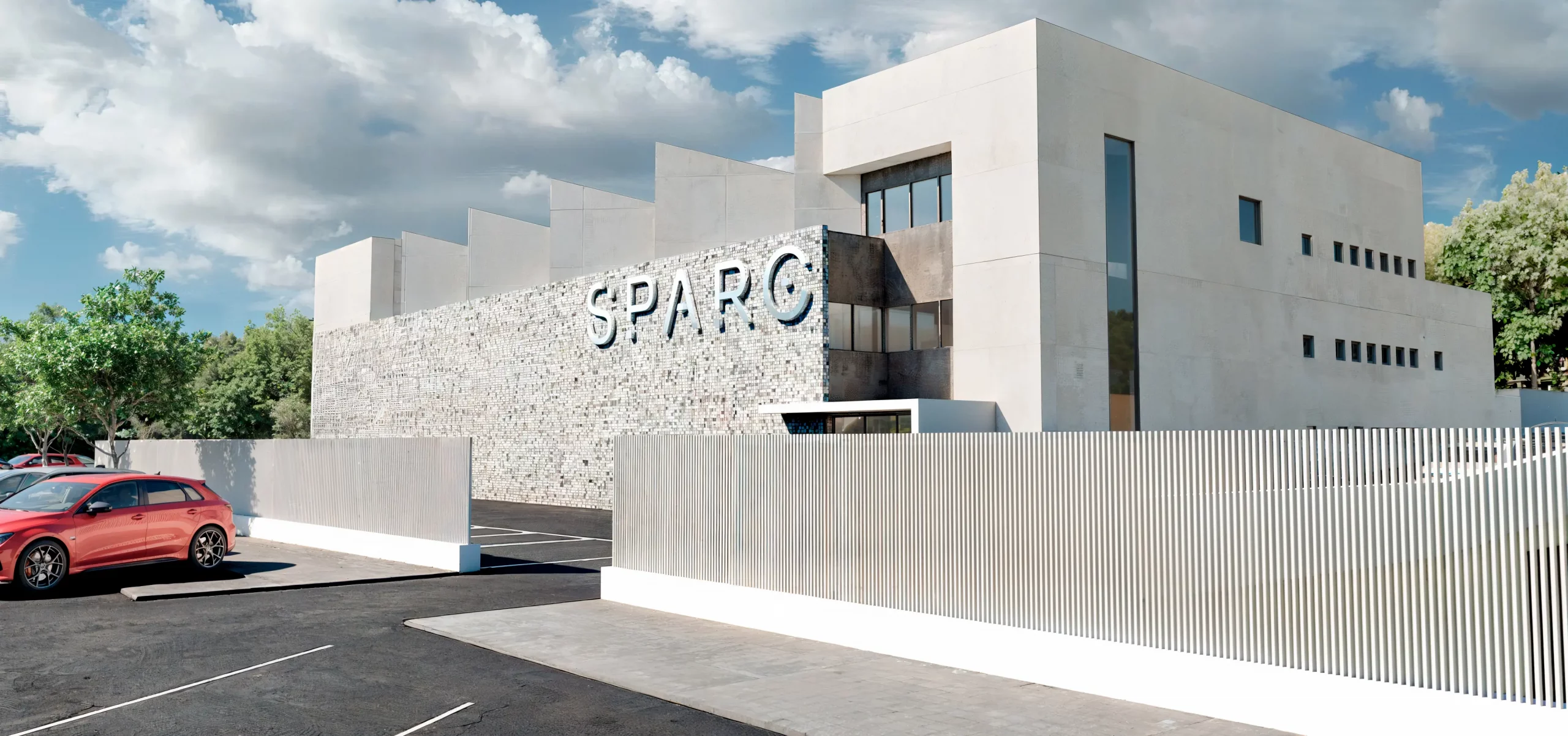 La fachada se proyecta con paneles prefabricados de hormigón con aislamiento incorporado, combinados con zonas en composite mediante sistema de fachada ventilada. En la planta alta destacan los muros cortina de aluminio y vidrio, que aportan luminosidad y refuerzan el carácter tecnológico del conjunto.